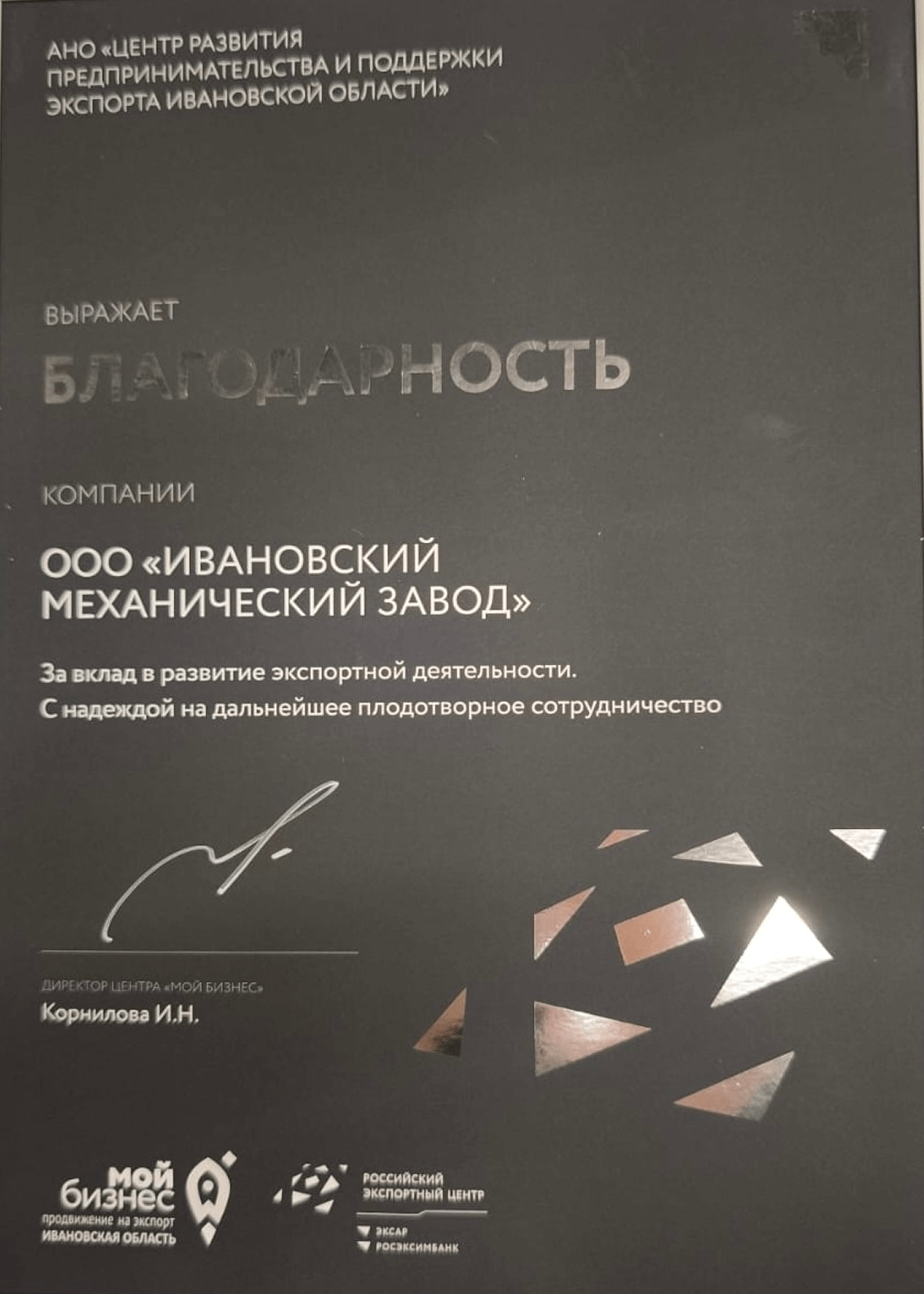 Наша награда — благодарность за вклад в развитие экспортной деятельности региона. Для нас это важное признание и стимул двигаться дальше!